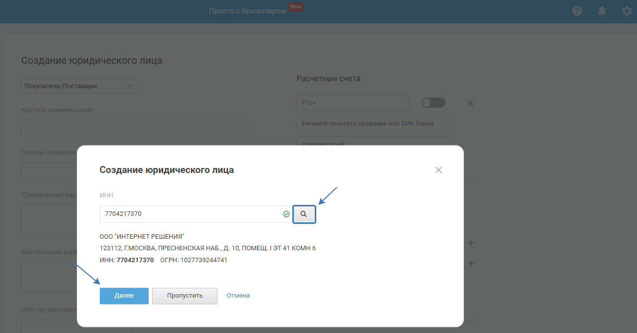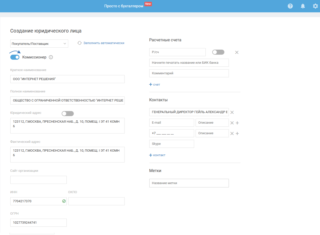 Нажмите на кнопку поиска. Данные контрагента заполнятся автоматически: