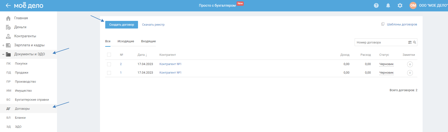 Для создания договора зайдите в раздел «Документы и ЭДО» — «Договоры». Нажмите на кнопку «Создать договор»: