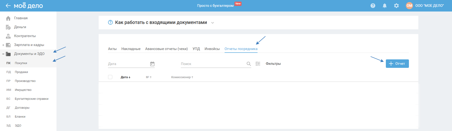 В разделе «Документы и ЭДО» — «Покупки» выберите вкладку «Отчёты посредника» и нажмите кнопку «+ Отчёт».