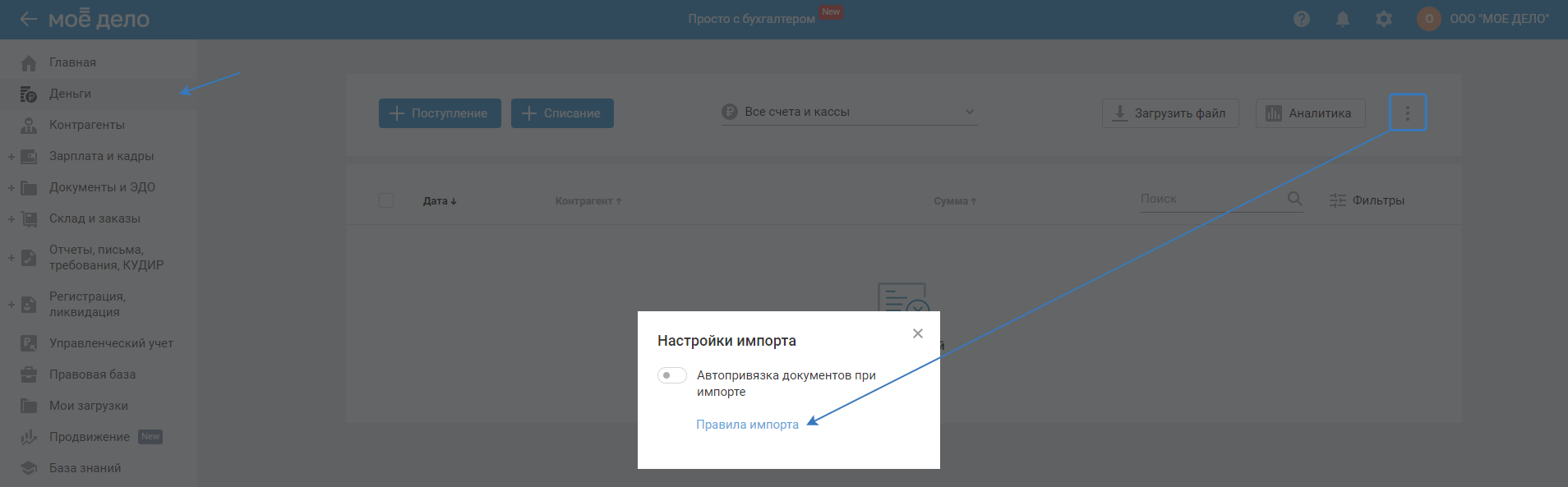 Для этого зайдите в раздел «Деньги» и в правом верхнем углу нажмите на три точки. В открывшемся окне нажмите на «Правила импорта»:
