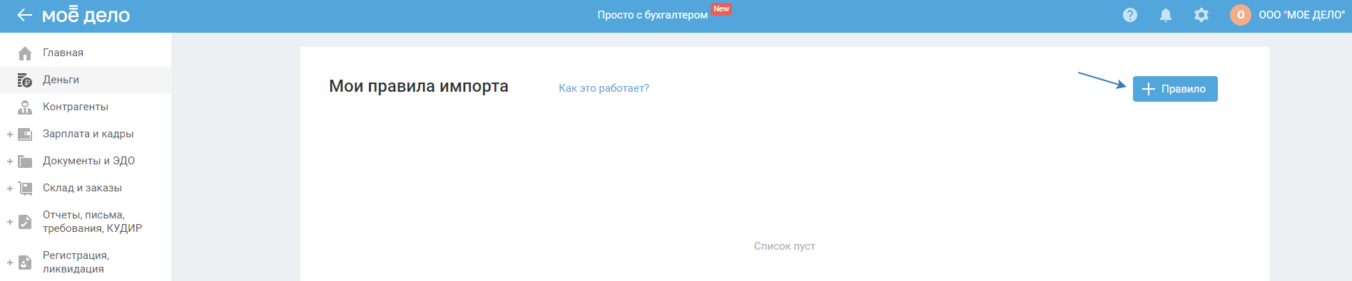Откроется окно «Мои правила импорта». Нажмите справа кнопку «+ Правило»: