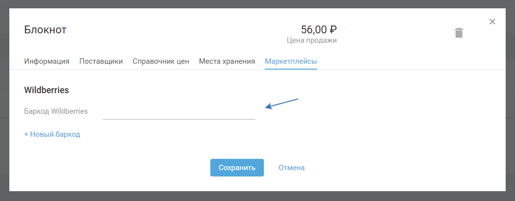 Во вкладке «Маркетплейсы» заполните поле «Баркод Wildberries», чтобы документы из маркетплейсов правильно загружались в сервис: