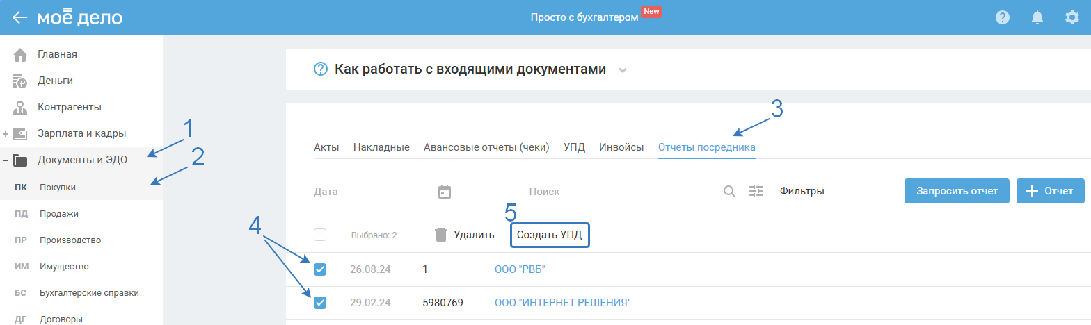 После создания УПД, кликнув на скрепку напротив отчёта посредника, вы увидите связь между отчётом посредника и УПД. Аналогично в разделе УПД.