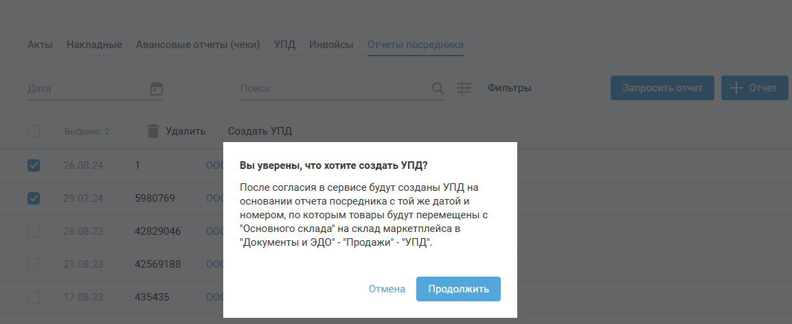 1. В таблице «Отчёты посредника» выделите отчёты (но не более 10 шт.), на основании которых нужно создать УПД о перемещении на склад маркетплейса.