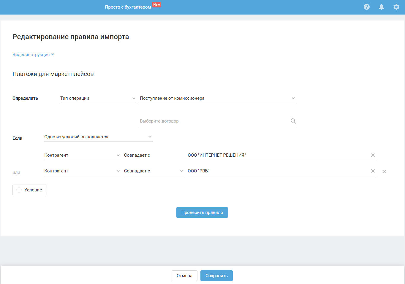 - Ниже в условиях выберите «Контрагент» и укажите название маркетплейса, с которым работаете. Если нужно добавить несколько маркетплейсов, нажмите кнопку «+ Условие».