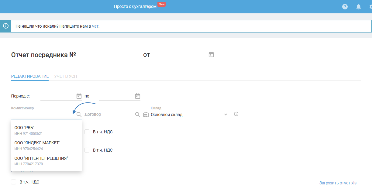 В открывшемся отчёте выберите маркетплейс в строке «Комиссионер» и номер договора в строке «Договор» из выпадающего списка: