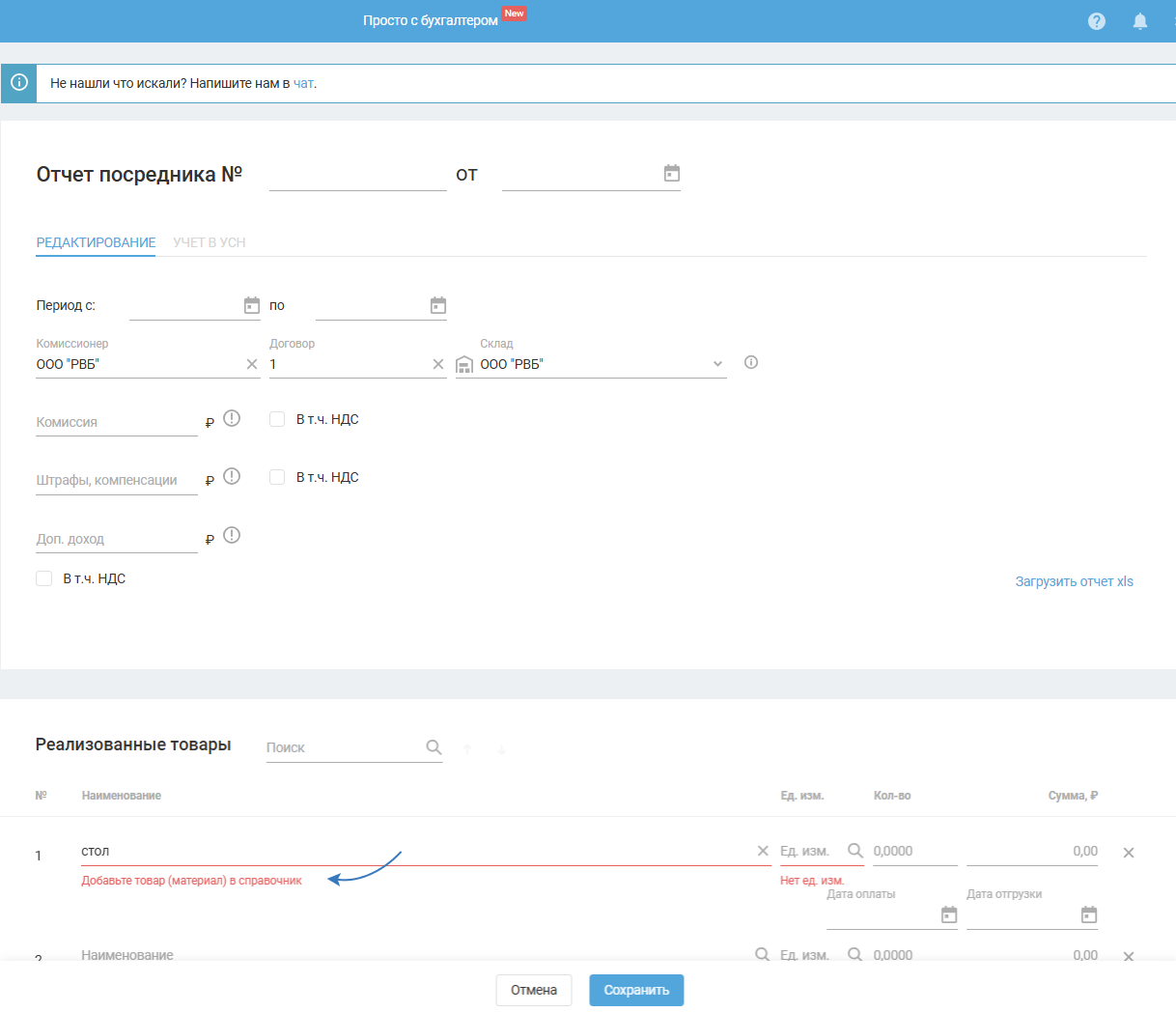 Если при загрузке отчёта посредника товара нет в сервисе, его нужно добавить. Для этого нажмите кнопку «Добавить товар (материал) в справочник»: