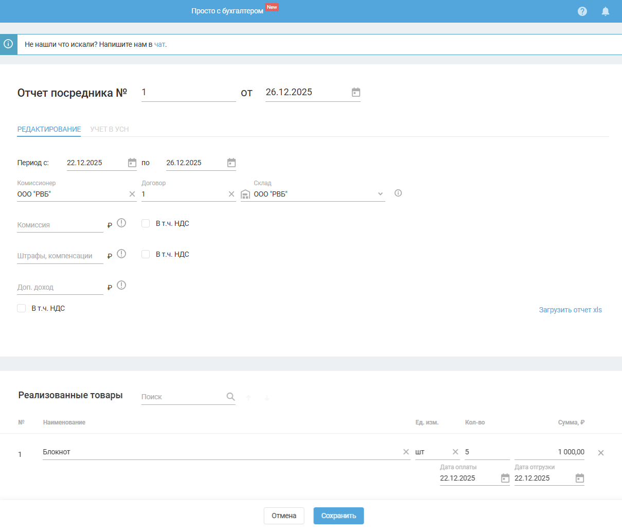 Если товары были возвращены покупателем, заполните блок «Возврат». Из выпадающего списка в графе «Наименование» выберите товары, которые были возвращены, укажите их количество и стоимость. В графе «Документ реализации» укажите отчёт посредника, в котором отражена продажа этого товара. Нажмите кнопку «Сохранить».