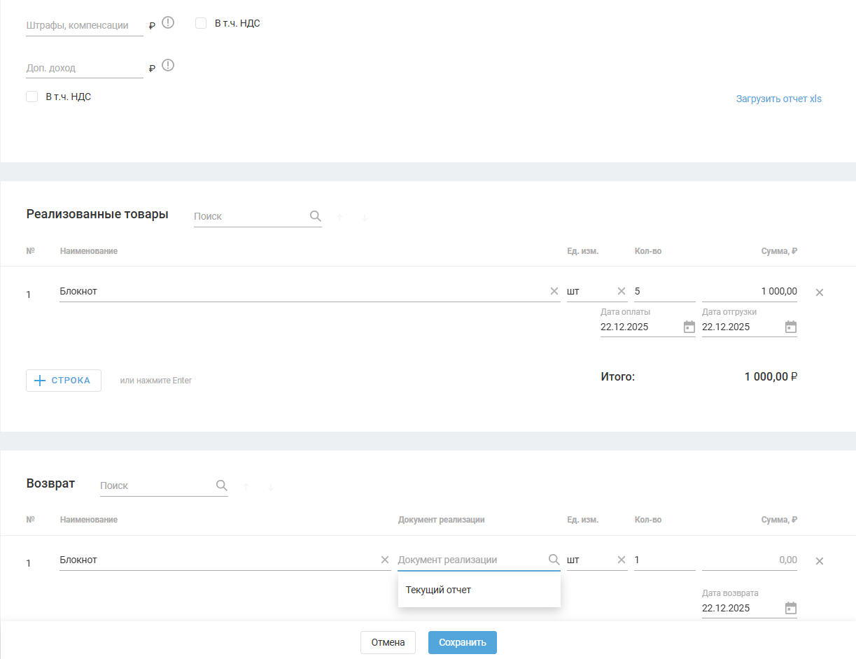 - В блоке «Реализованные товары» из выпадающего списка графы «Наименование» выберите товары, проданные маркетплейсом, укажите их количество и стоимость.