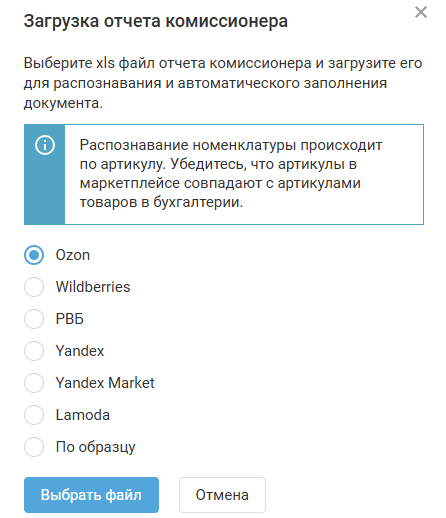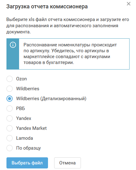 Для распознавания отчёта посредника артикулы товара в сервисе «Моё дело» и в маркетплейсе должны совпадать.