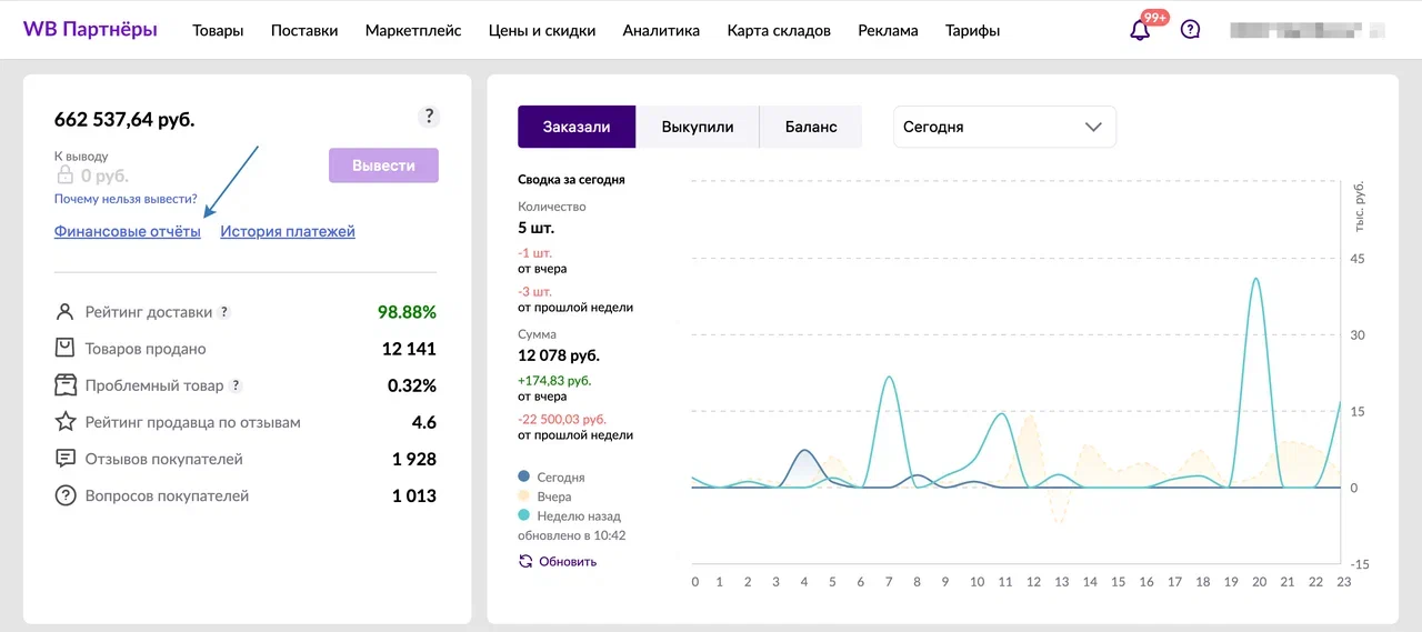 1) Войдите в личный кабинет Wildberries в раздел «Финансовые отчёты» на главной странице кабинета: