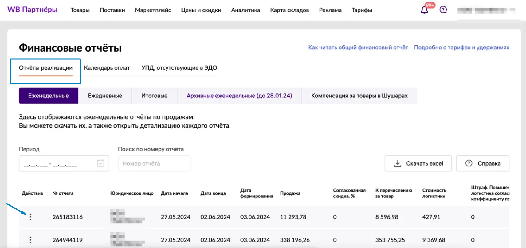 2) Во вкладке «Отчёты реализации» нажмите на значок в виде трёх точек и скачайте детализацию для выбранного отчёта. Файл загрузится на ваш компьютер в формате xls: