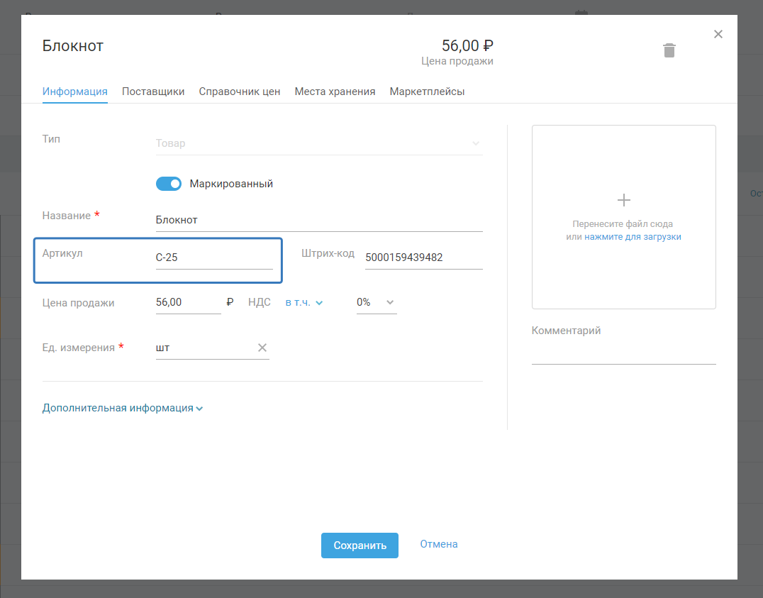 При работе с маркетплейсами в карте товара во вкладке «Информация» необходимо указывать артикул. Он должен быть одинаковым в сервисе и на всех площадках, где ведётся торговля. Это нужно для распознавания отчётов посредника и автоматической загрузки их в сервис: