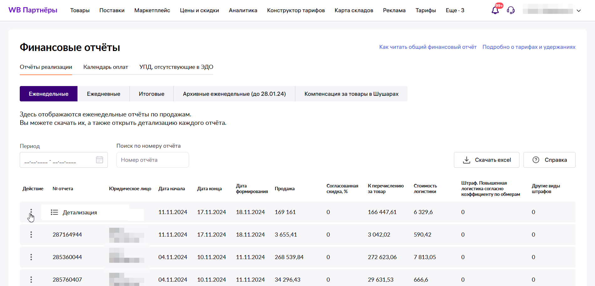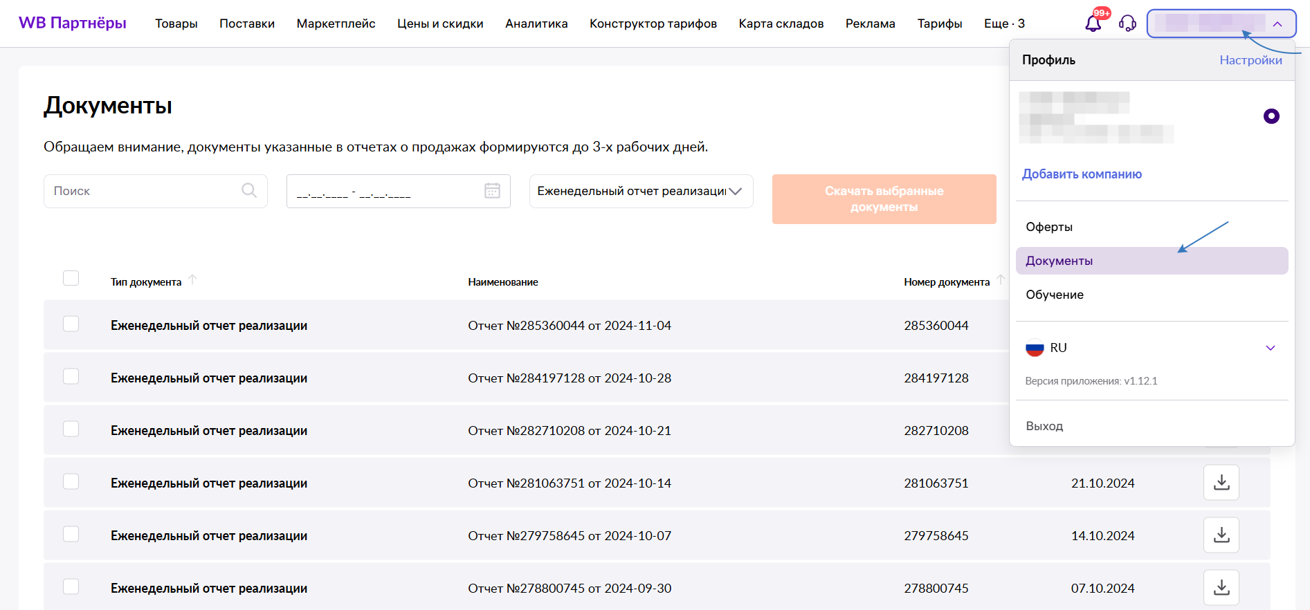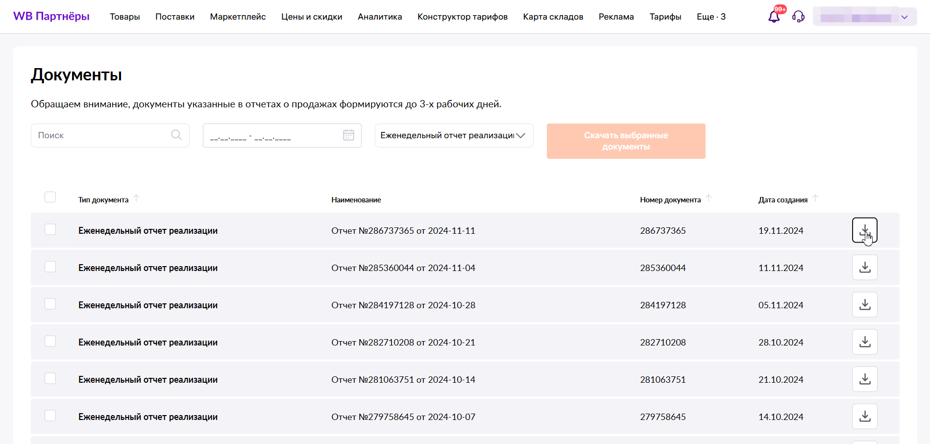 - Профиль — Документы — Еженедельный отчёт реализации (скачиваете по конкретному отчету).