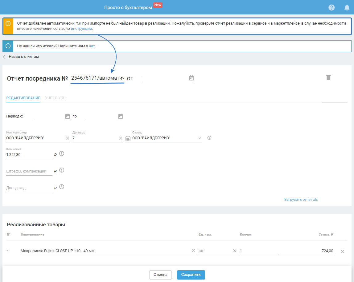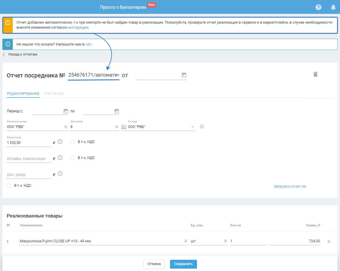 В сервисе дополнительно автоматически формируется отчёт посредника с № .../автоматический, если при импорте не был найден товар в реализации.