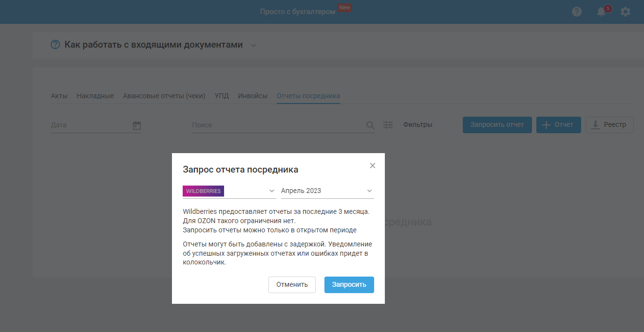 Для загрузки отчёта в ручном режиме перейдите в раздел «Покупки — Отчёты посредника — Запросить отчёт»: