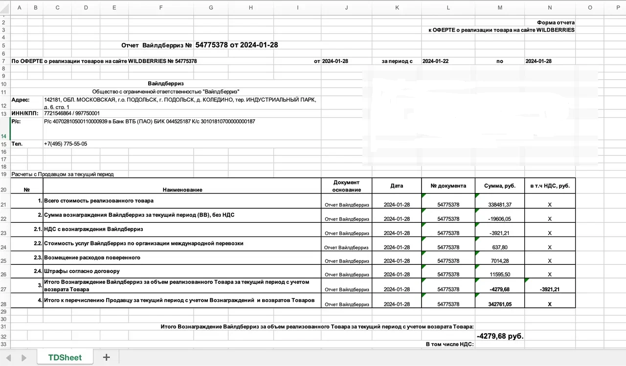 - НДС с Вознаграждения Вайлдберриз с минусом (ООО «РВБ»)