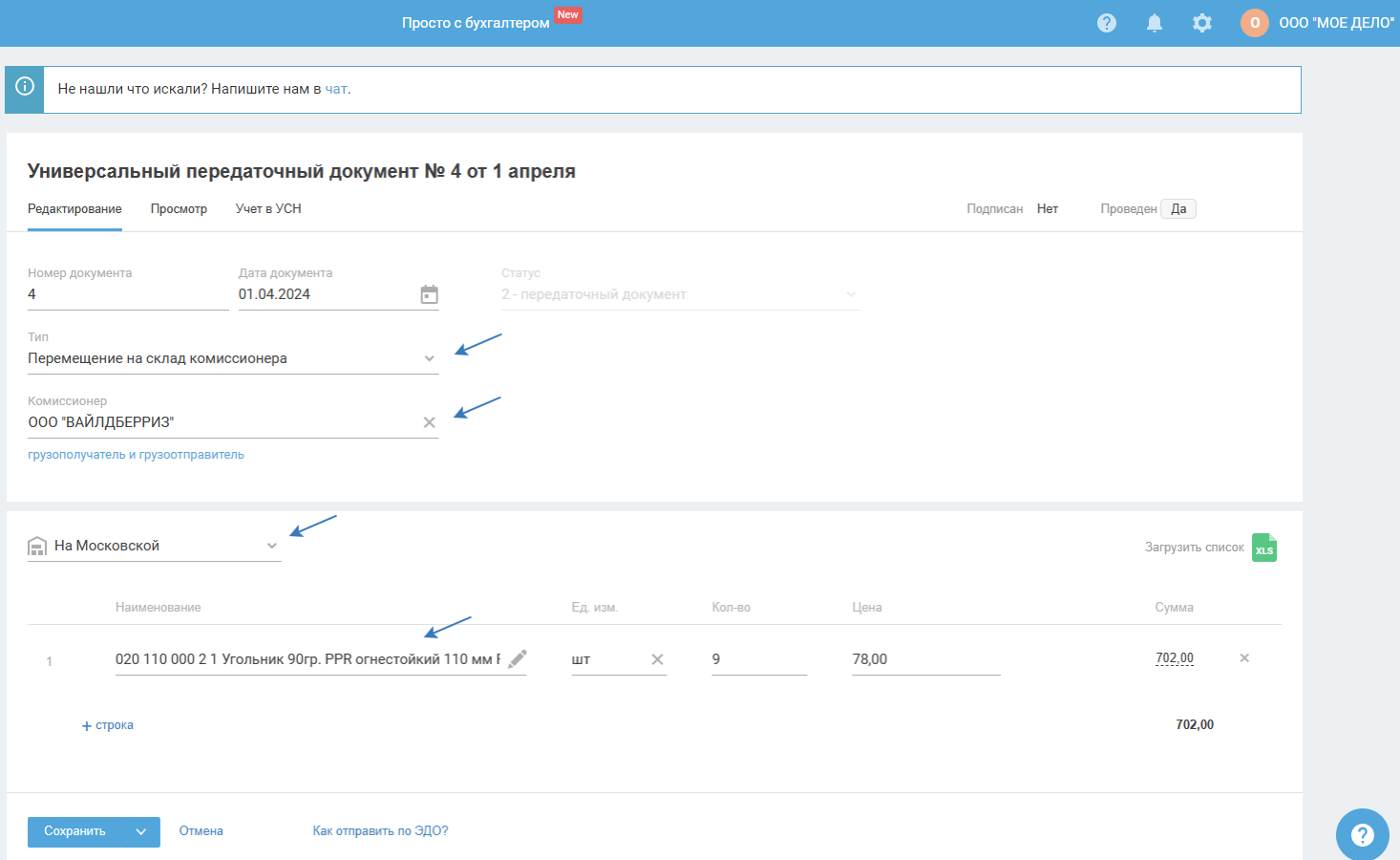 После сохранения УПД товар переместится на склад маркетплейса в сервисе.