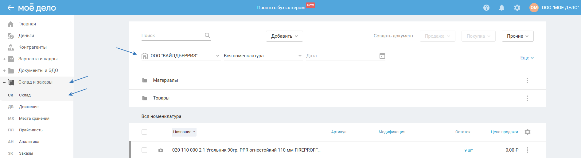 Первоначально необходимо переместить товар со склада ООО «ВАЙЛДБЕРРИЗ» на Основной склад:
