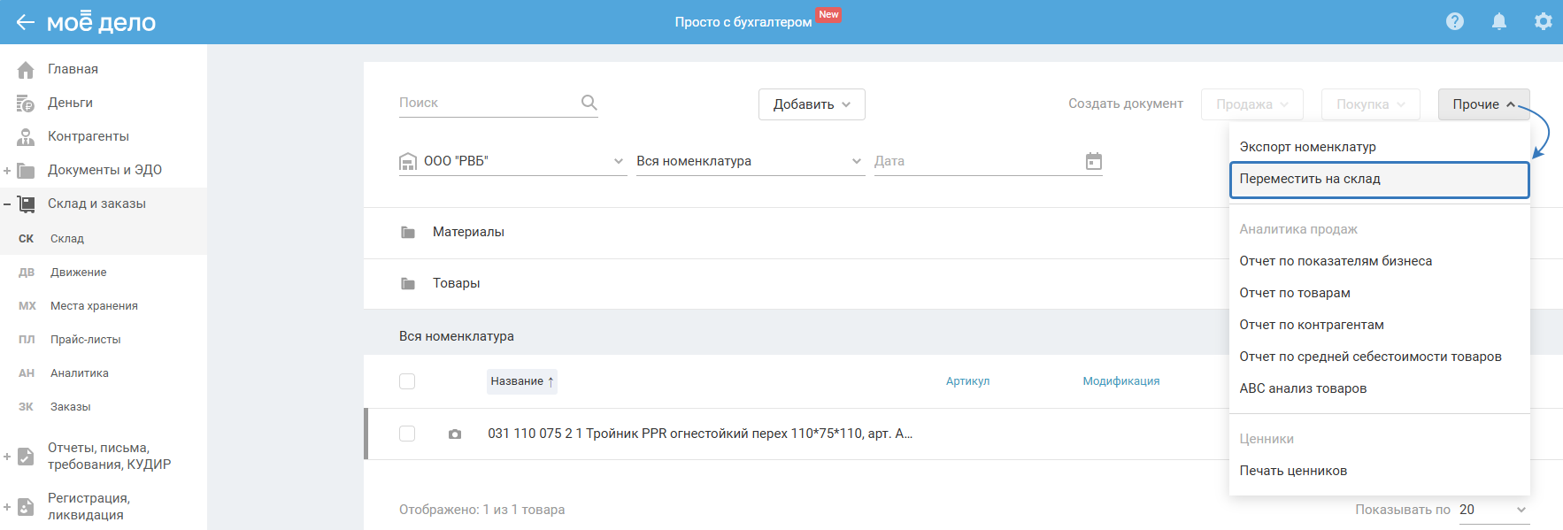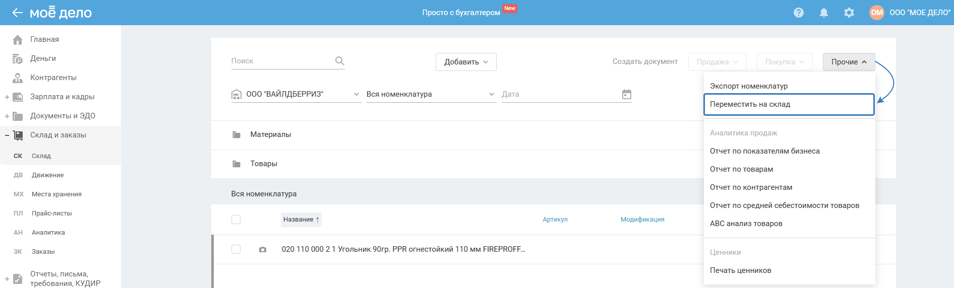 Для этого перейдите в раздел «Склад и заказы» — «Склад», кликните по кнопке «Прочие» и выберите «Переместить на склад».