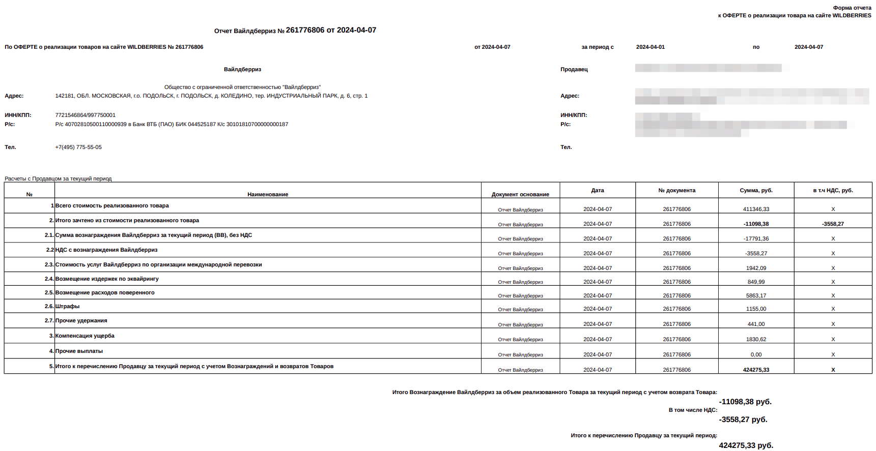 Учет доходов и расходов (Отчет посредника/Отчет о реализации). Wildberries (ООО «РВБ»)