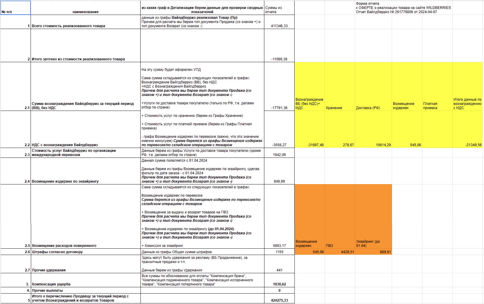 (Вознаграждение Вайлдберриз (ООО «РВБ»), без НДС + НДС с Вознаграждения Вайлдберриз (ООО «РВБ») + Услуги по доставке товара покупателю только по России + Доплаты + Стоимость хранения + Стоимость платной приёмки - Возмещение издержек по перевозке) +