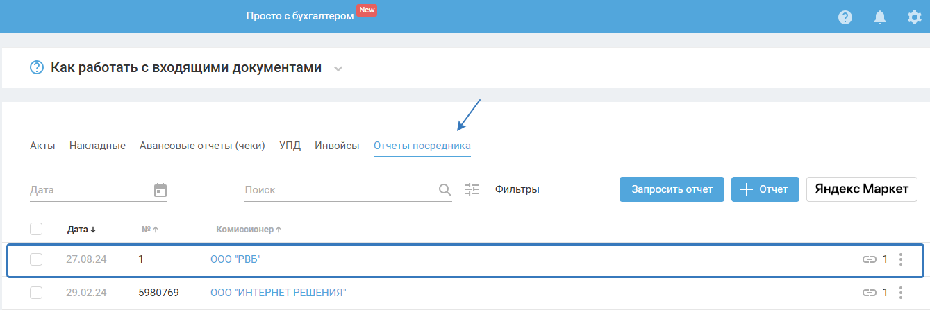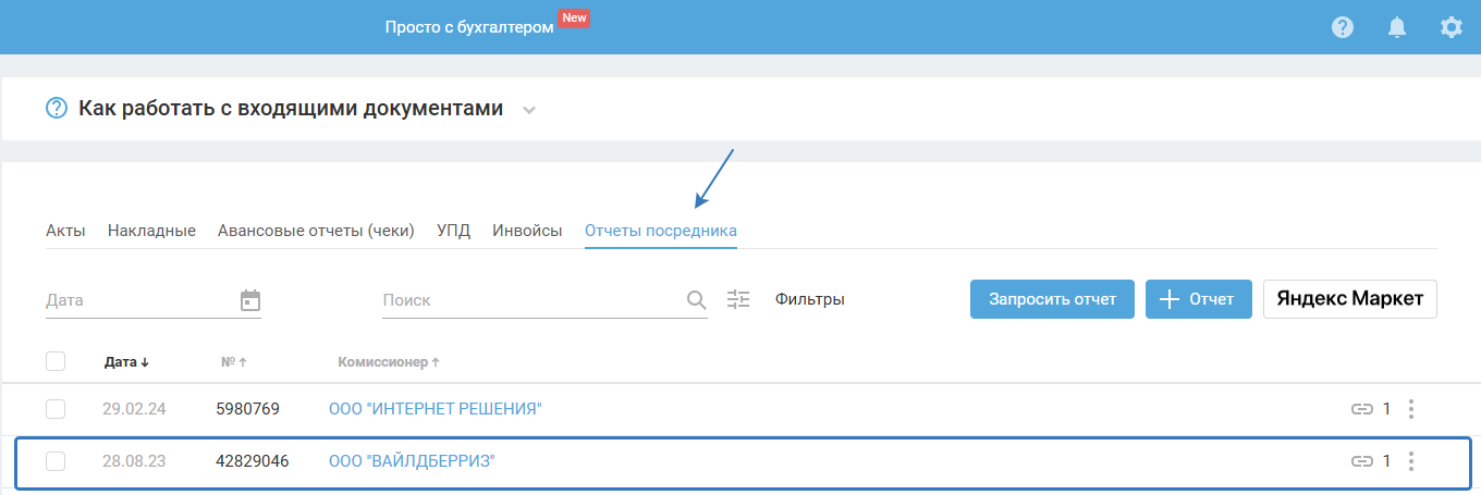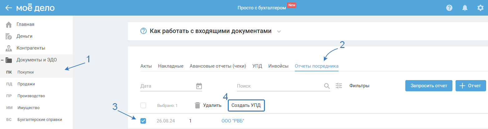 После создания УПД, кликнув на скрепку напротив отчёта посредника, вы увидите связь между отчётом посредника и УПД. Аналогично в разделе УПД.