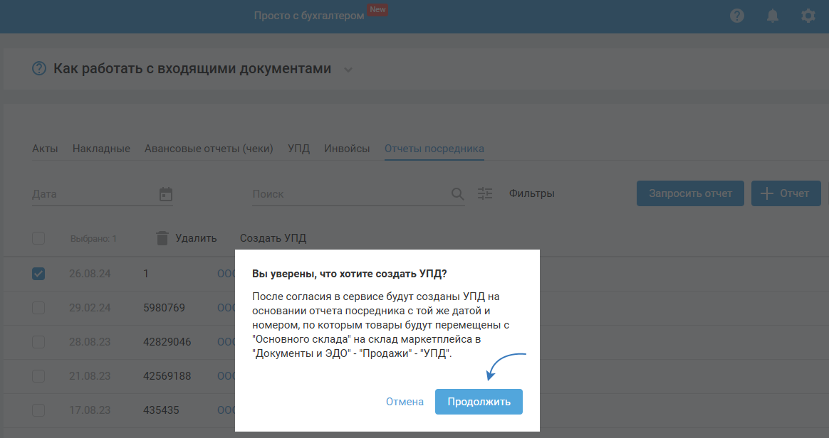1. В таблице «Отчёты посредника» выделите отчёты (но не более 10 шт.), на основании которых нужно создать УПД о перемещении на склад маркетплейса.
