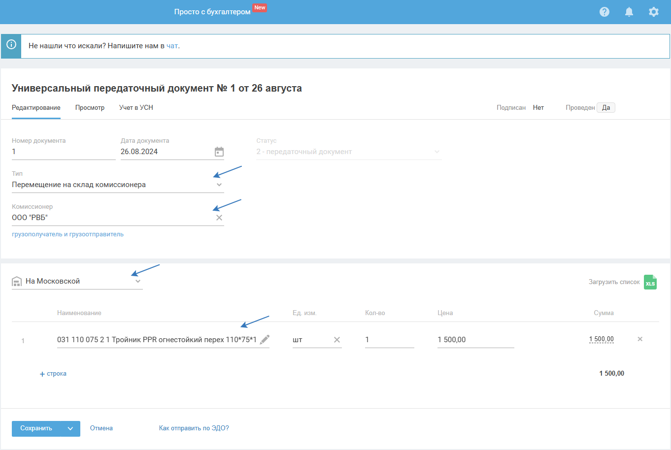 Перемещение товара на склад комиссионера отражают универсальным передаточным документом — УПД.