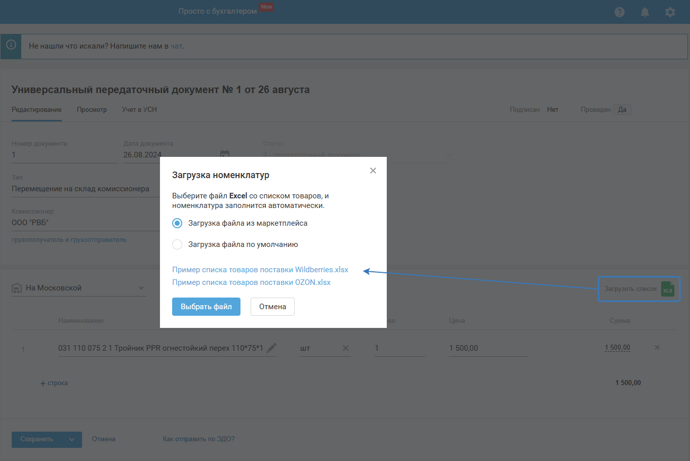 Чтобы загрузить товары из своего списка, нажмите на кнопку «Выбрать файл». Выберите ваш файл для загрузки и нажмите на кнопку «Открыть». После этого товар добавится в УПД.