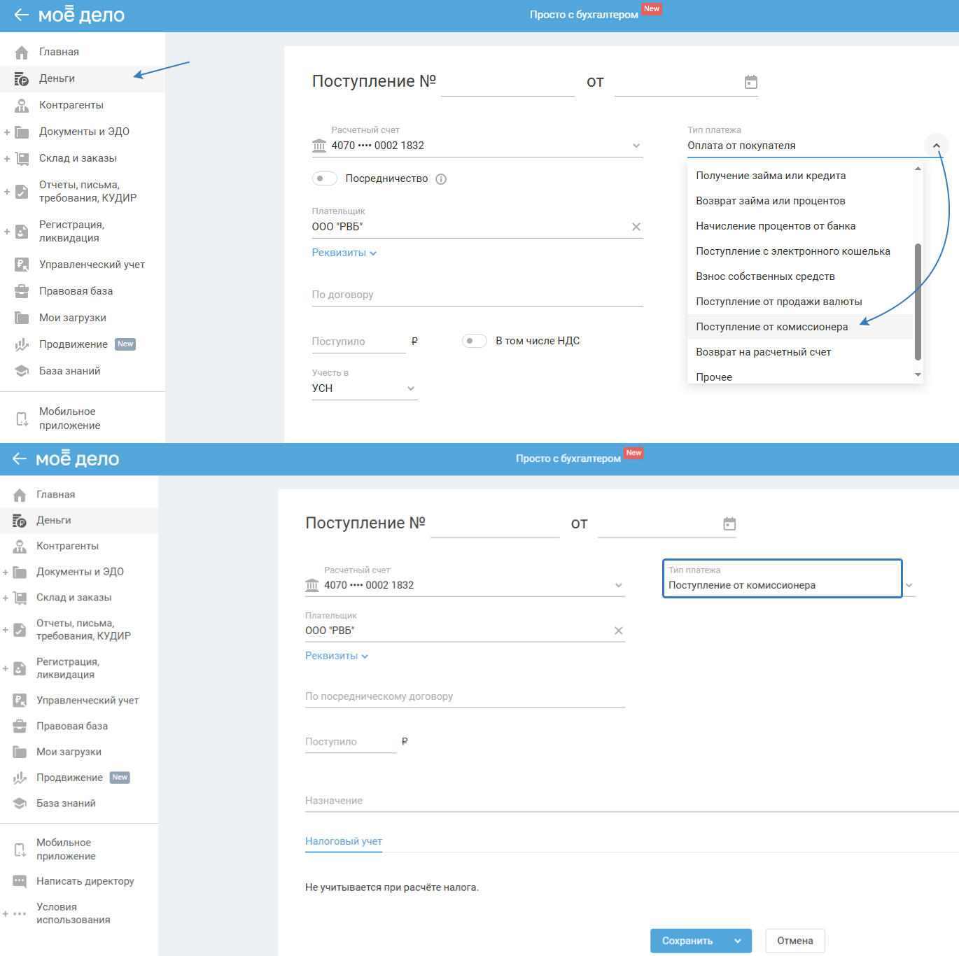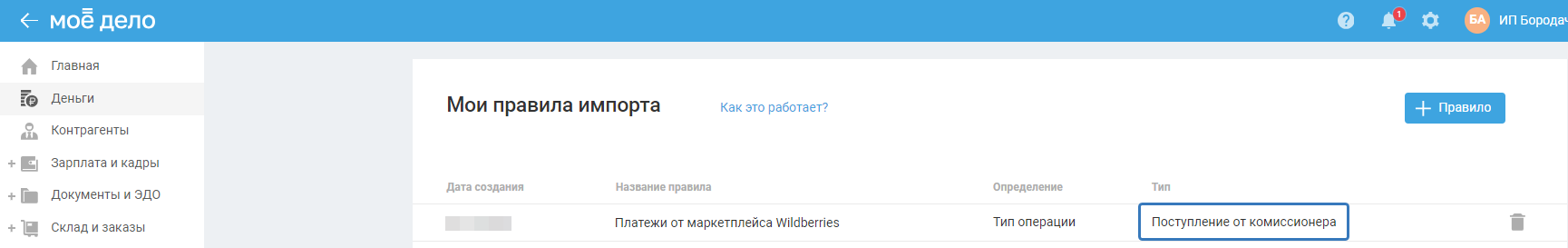 Обратите внимание. При включении интеграции с маркеплейсами или запросе отчёта посредника в сервисе автоматически создаётся правило импорта в Деньгах с типом «Поступление от комиссионера»: