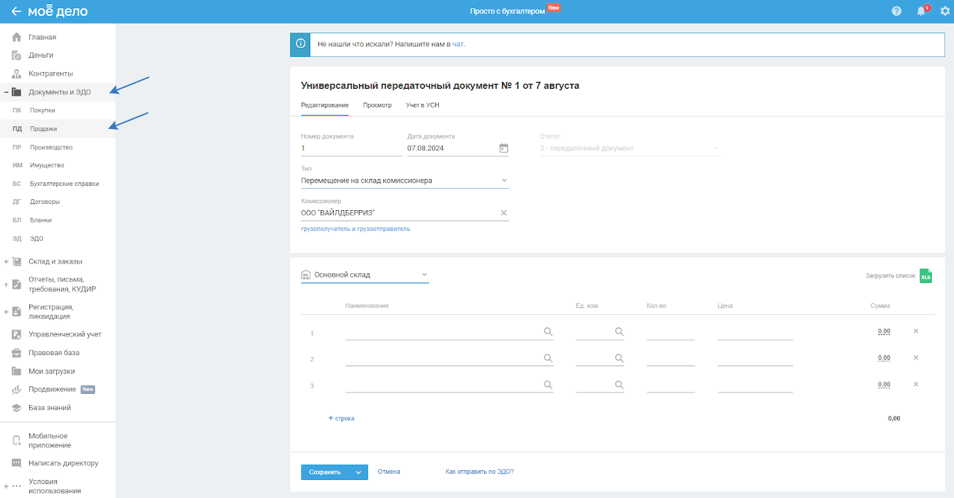 После чего будет создан УПД в разделе «Документы и ЭДО — Продажи — УПД» с типом «Перемещение на склад комиссионера» с той же датой и номером, по которым товары будут перемещены с «Основного склада» на склад маркетплейса.