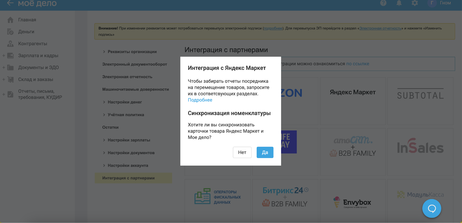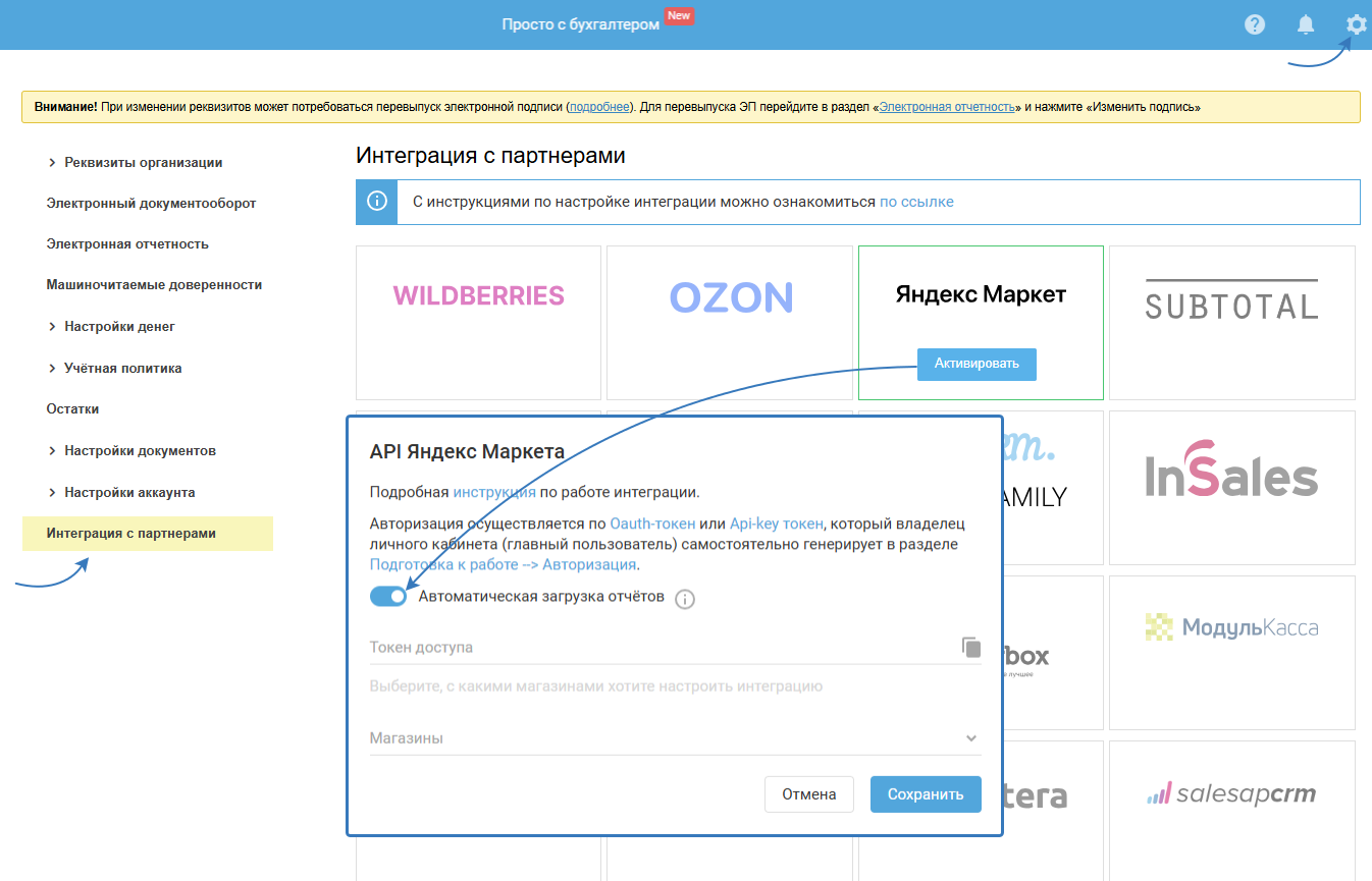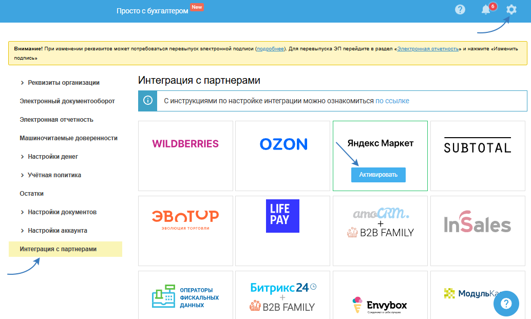- в реквизитах, нажав на шестерёнку в правом верхнем углу, далее «Интеграция с партнёрами».