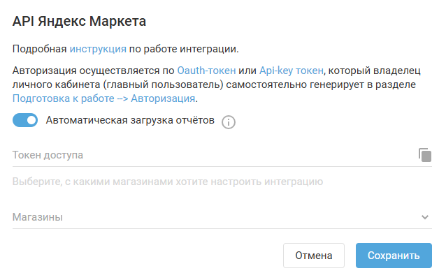 Для включения интеграции нужно сформировать токен (API ключ). Либо вы формируете токен в сервисе, либо самостоятельно по инструкции Яндекса.