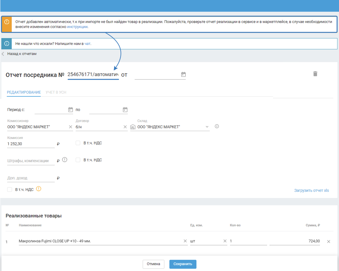 В сервисе дополнительно автоматически формируется отчёт посредника с № .../автоматический, если при импорте не был найден товар в реализации.