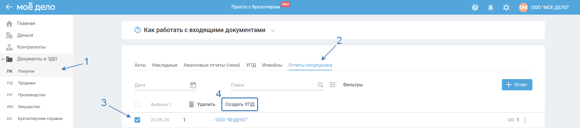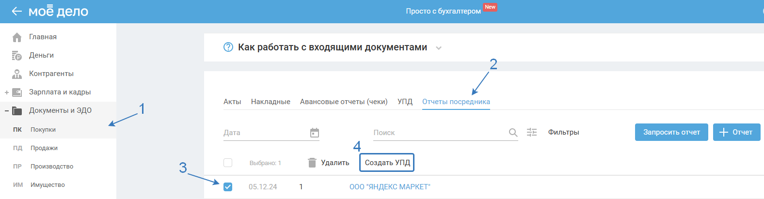 После создания УПД, кликнув на скрепку напротив отчёта посредника, вы увидите связь между отчётом посредника и УПД. Аналогично в разделе УПД.