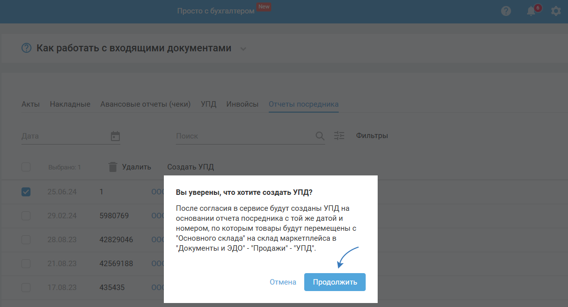 1. В таблице «Отчёты посредника» выделите отчёты (но не более 10 шт.), на основании которых нужно создать УПД о перемещении на склад маркетплейса.
