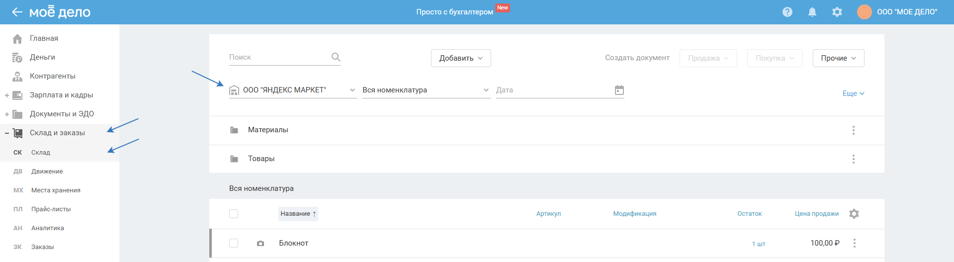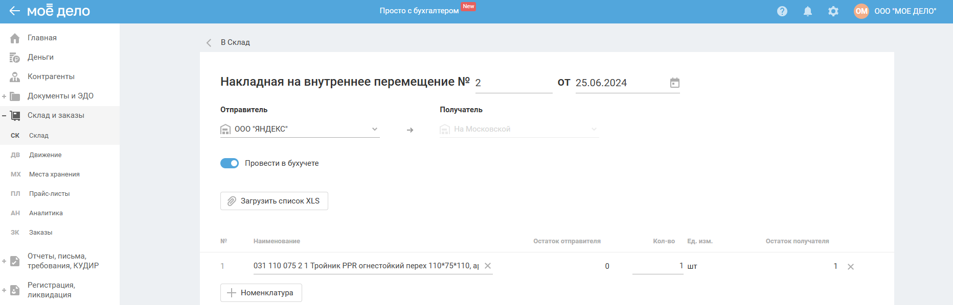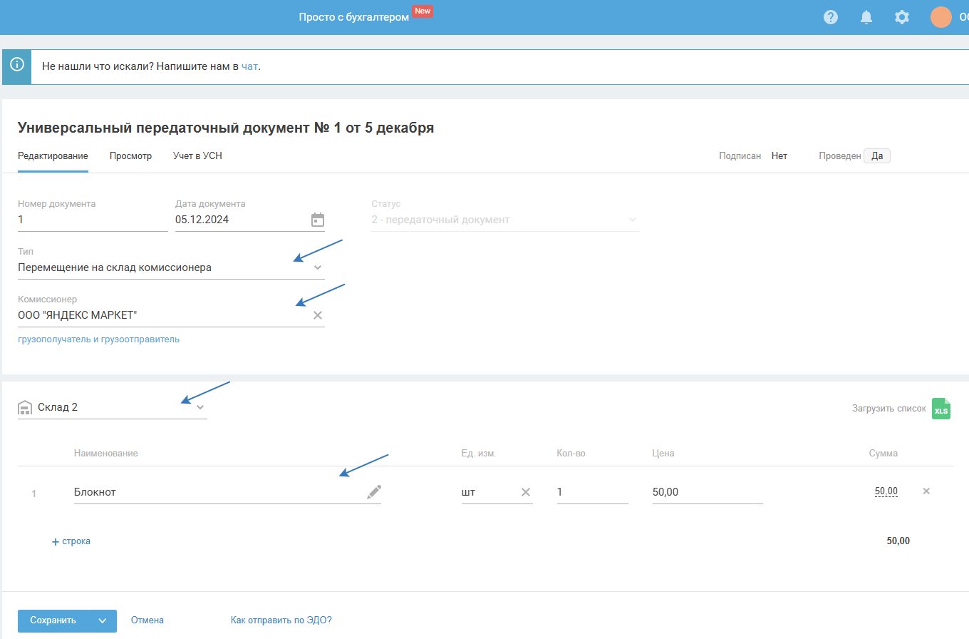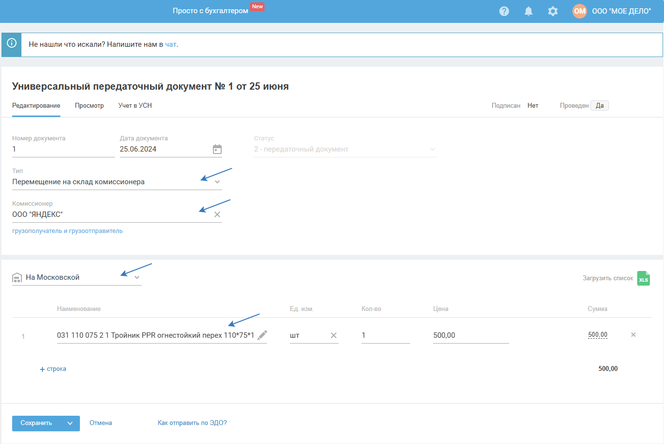 После сохранения УПД товар переместится на склад маркетплейса в сервисе.