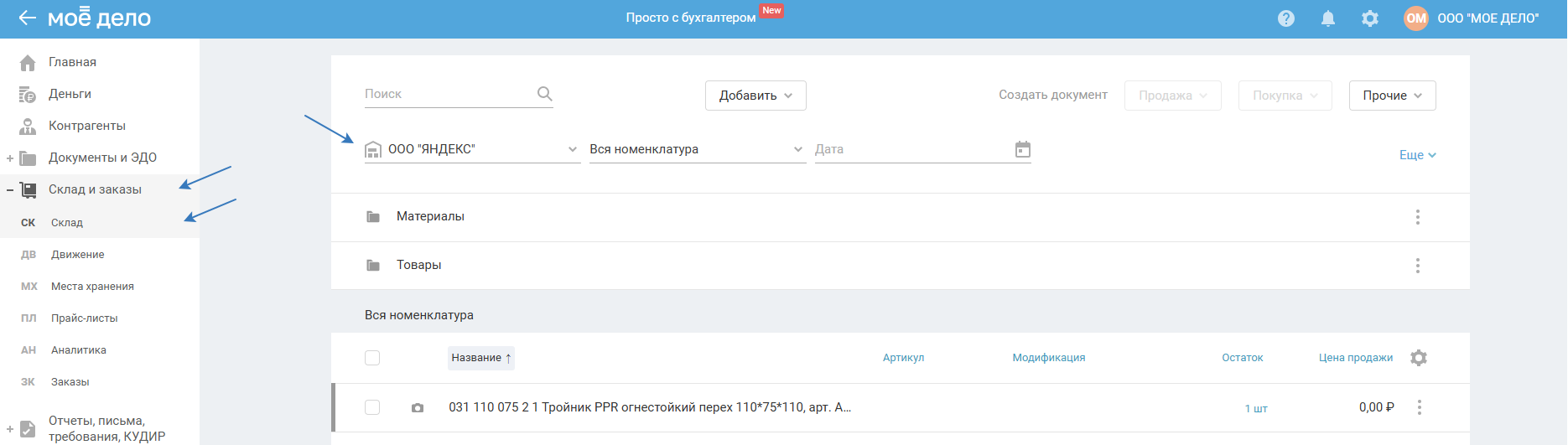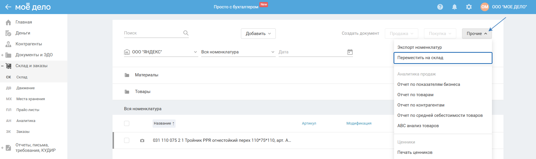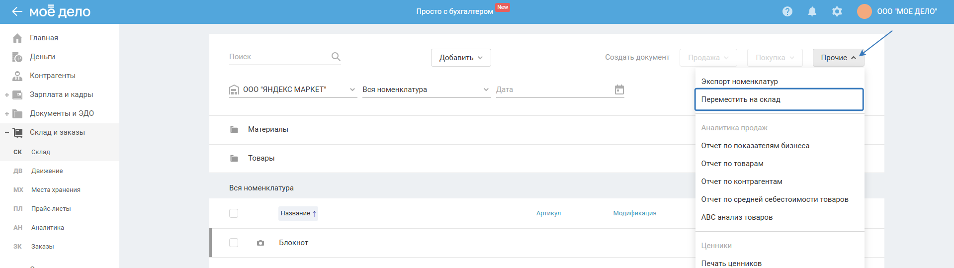 Для этого перейдите в раздел «Товары» — «Склад», кликните по кнопке «Прочие» и выберите «Переместить на склад».