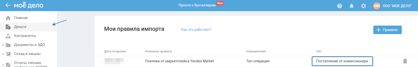 Обратите внимание. При включении интеграции с маркеплейсами или запросе отчёта посредника в сервисе автоматически создаётся правило импорта в Деньгах с типом «Поступление от комиссионера»: