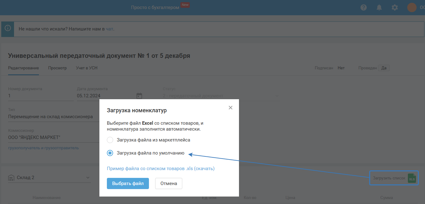 Чтобы загрузить товары из своего списка, нажмите на кнопку «Выбрать файл». Выберите ваш файл для загрузки и нажмите на кнопку «Открыть». После этого товар добавится в УПД.