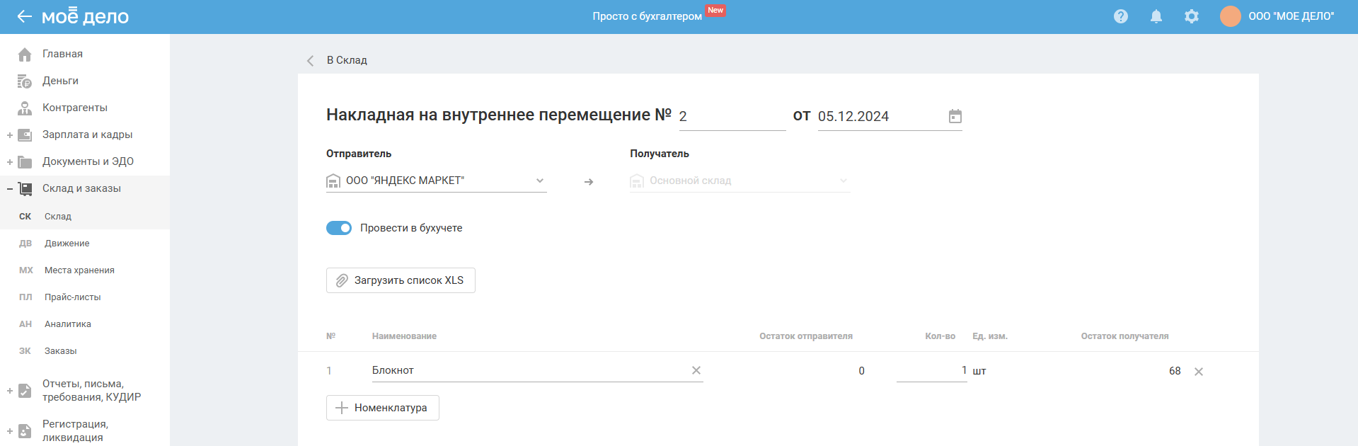 УПД на перемещение в личном кабинете «Моё дело» нужно создавать и при торговле со склада маркетплейса, и при торговле со своего склада.