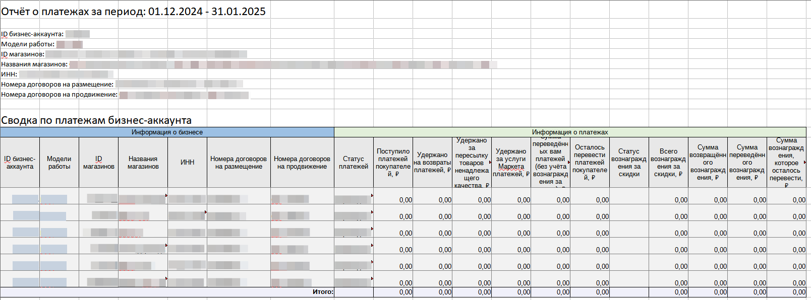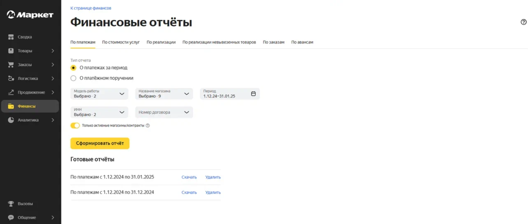Заполняется отчёт по данным из API. Аналог отчёта вы можете скачать в кабинете Яндекс Маркет — «Финансы» — «Закрывающие документы».