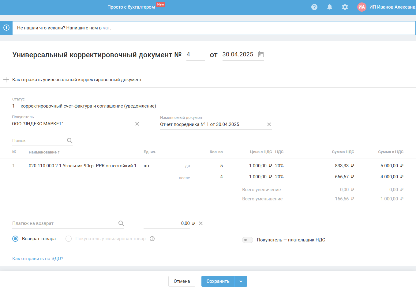 При возврате товара в отчёте посредника необходимо также создавать УКД на основании отчёта посредника.