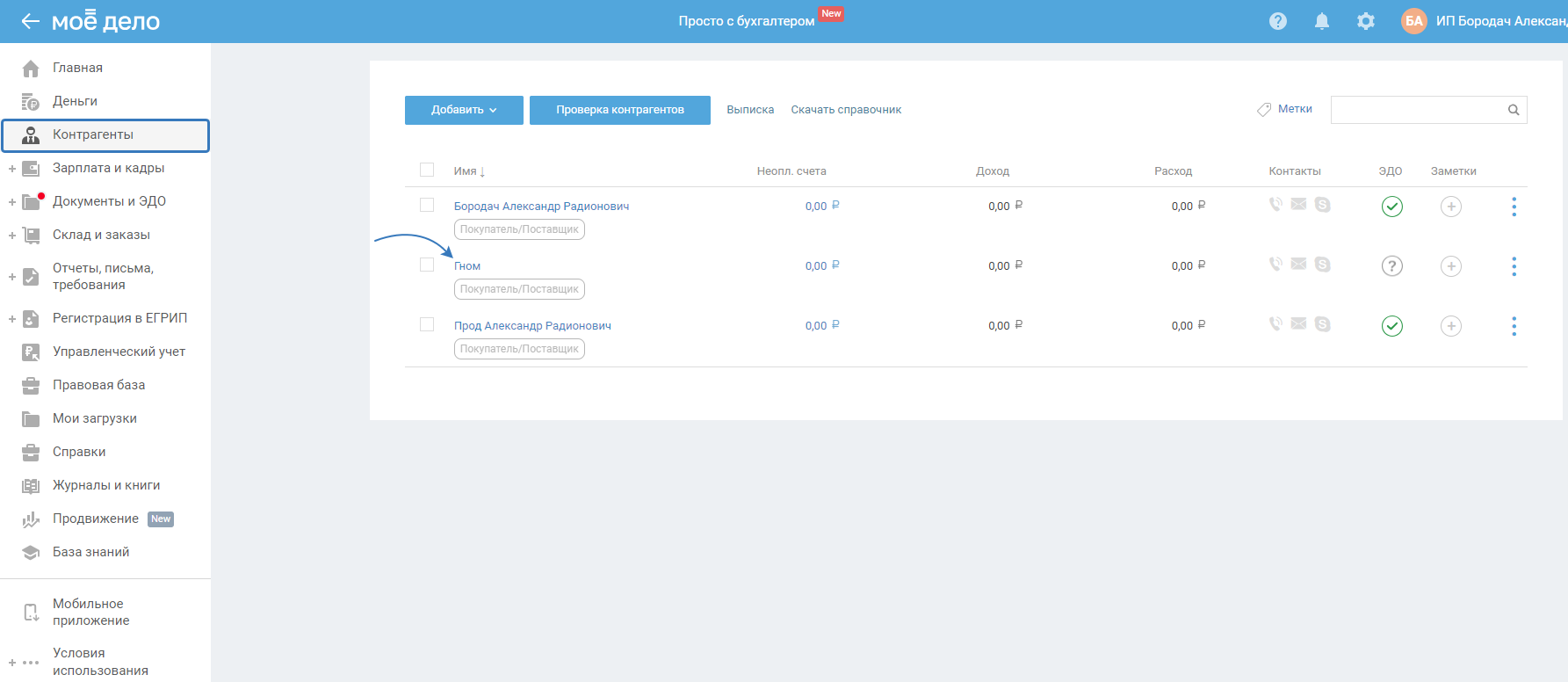В разделе «Контрагенты» нажмите на наименование контрагента: