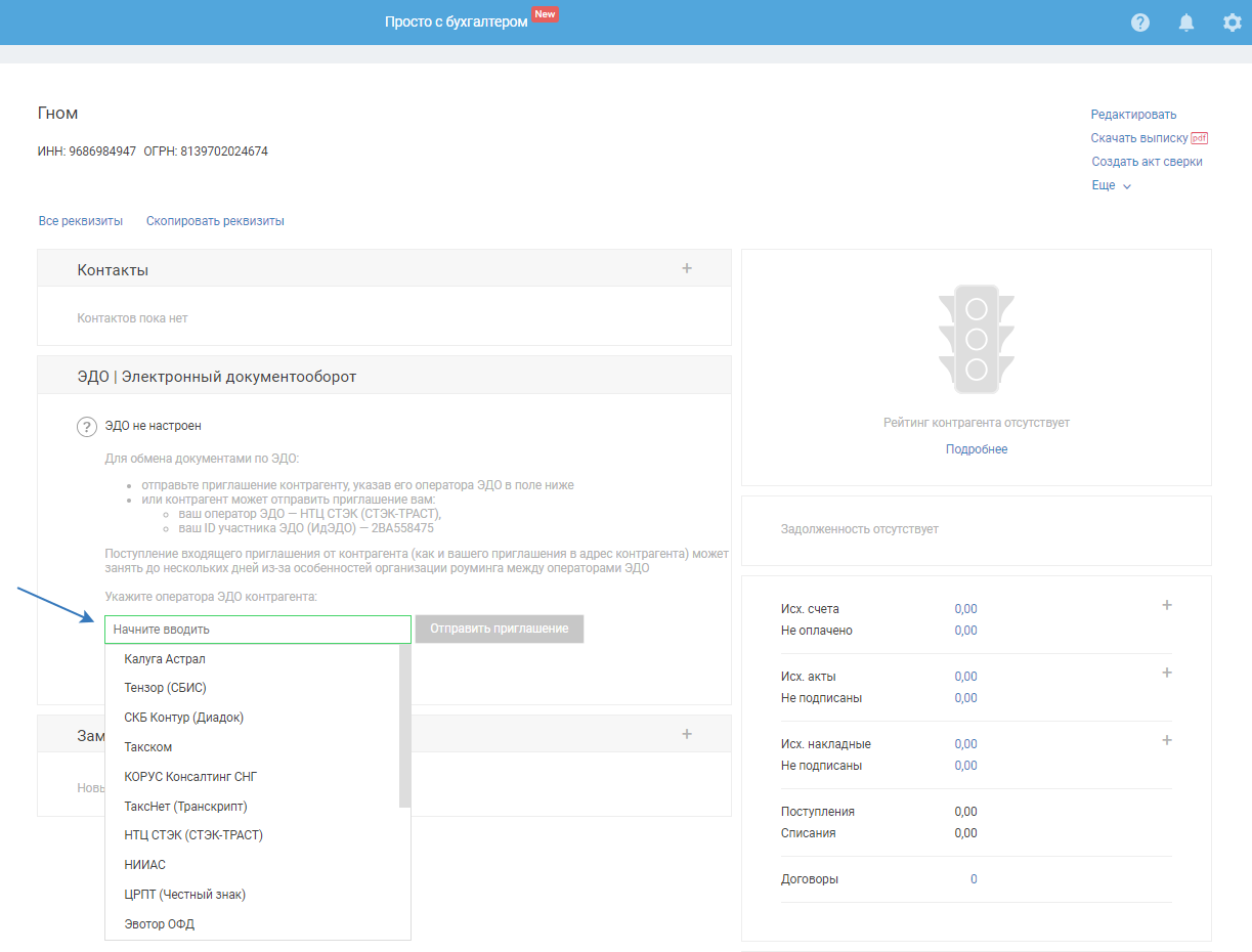 - Для начала обмена документами с контрагентами необходимо настроить с ними связь. Для этого в карточке контрагента выберите его оператора ЭДО и нажмите «Отправить приглашение». Или контрагент может прислать входящее приглашение вам, оно будет принято автоматически.