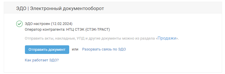 После того как контрагент подтвердит приглашение, статус изменится на «ЭДО настроен» :
