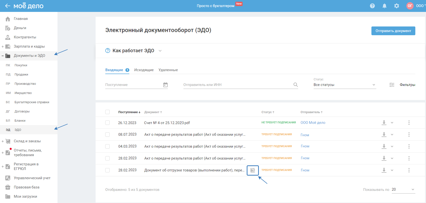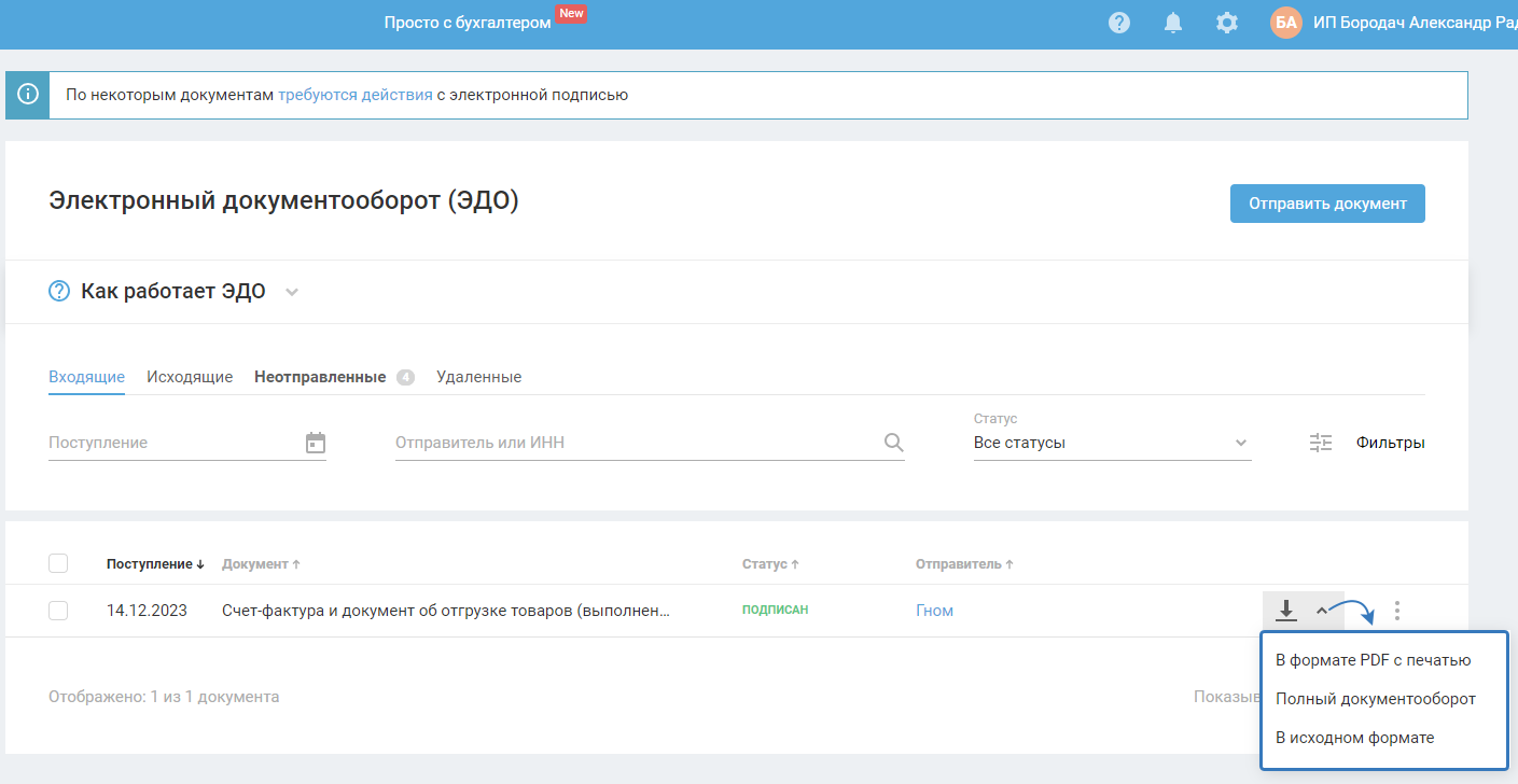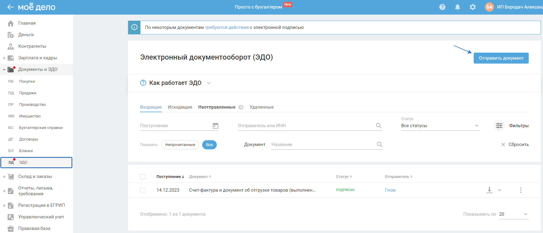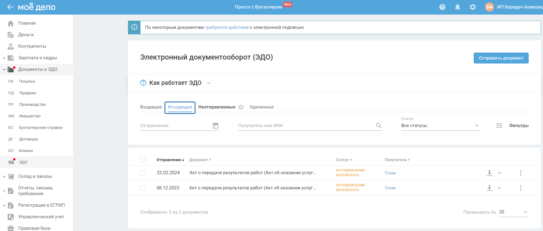 После подписания документ появится в разделе «ЭДО» во вкладке «Исходящие»: