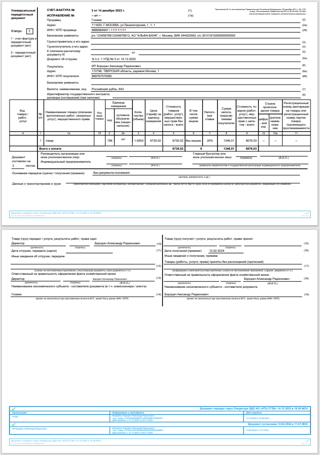 Подписание документа означает смену прав собственности на товар, указанный в УПД. Сведения о сделке передаются в «Честный знак».