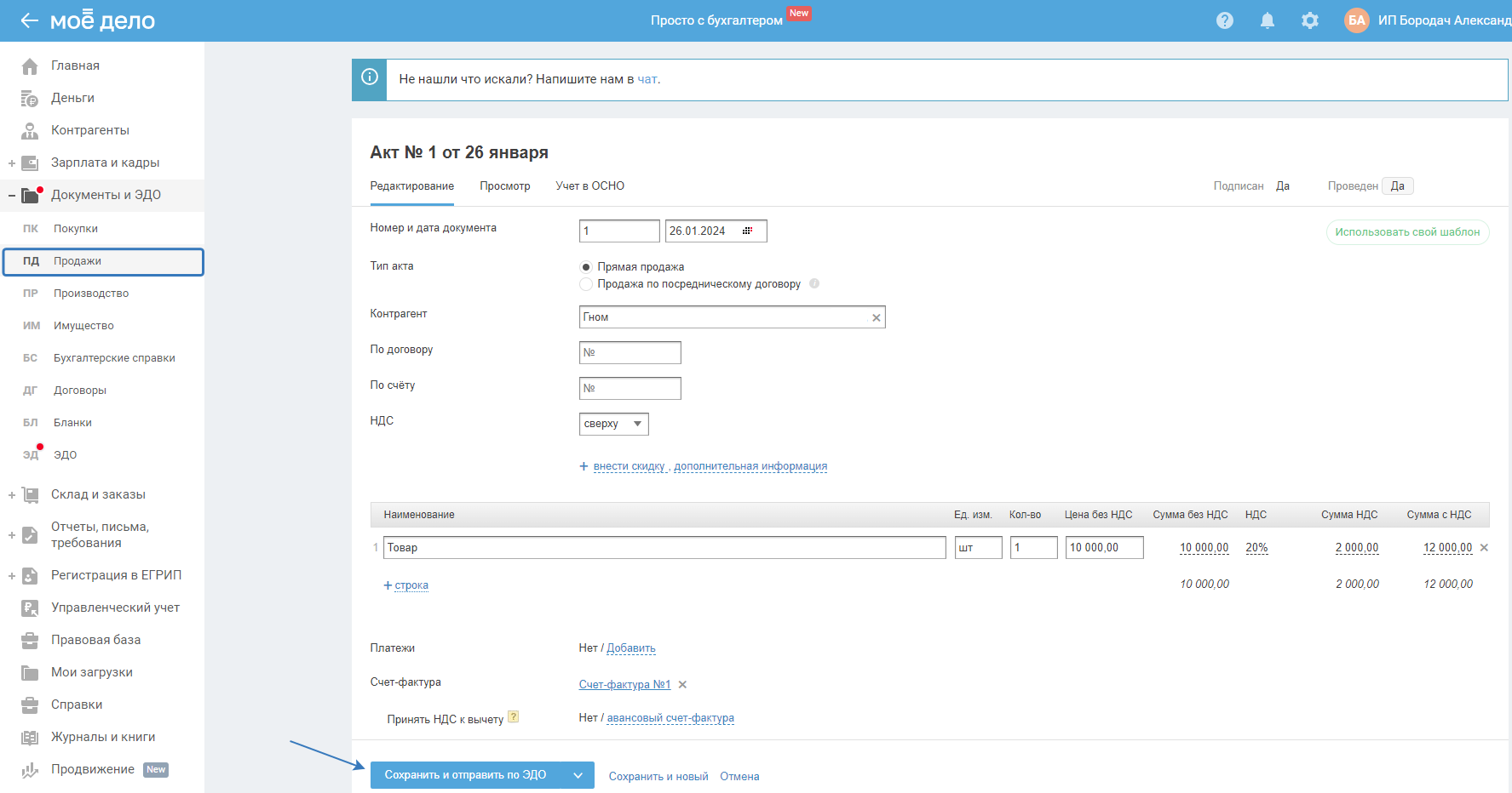 Создаваемые акты, накладные, счета-фактуры, УПД или УКД в разделе «Документы и ЭДО» — «Продажи» можно отправить по ЭДО контрагенту, с которым уже настроена связь, нажав «Сохранить и отправить по ЭДО».
